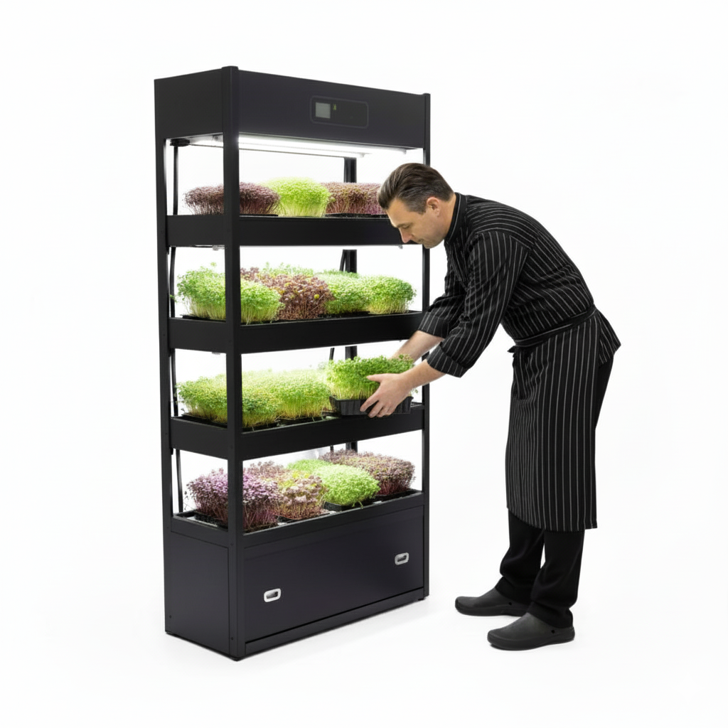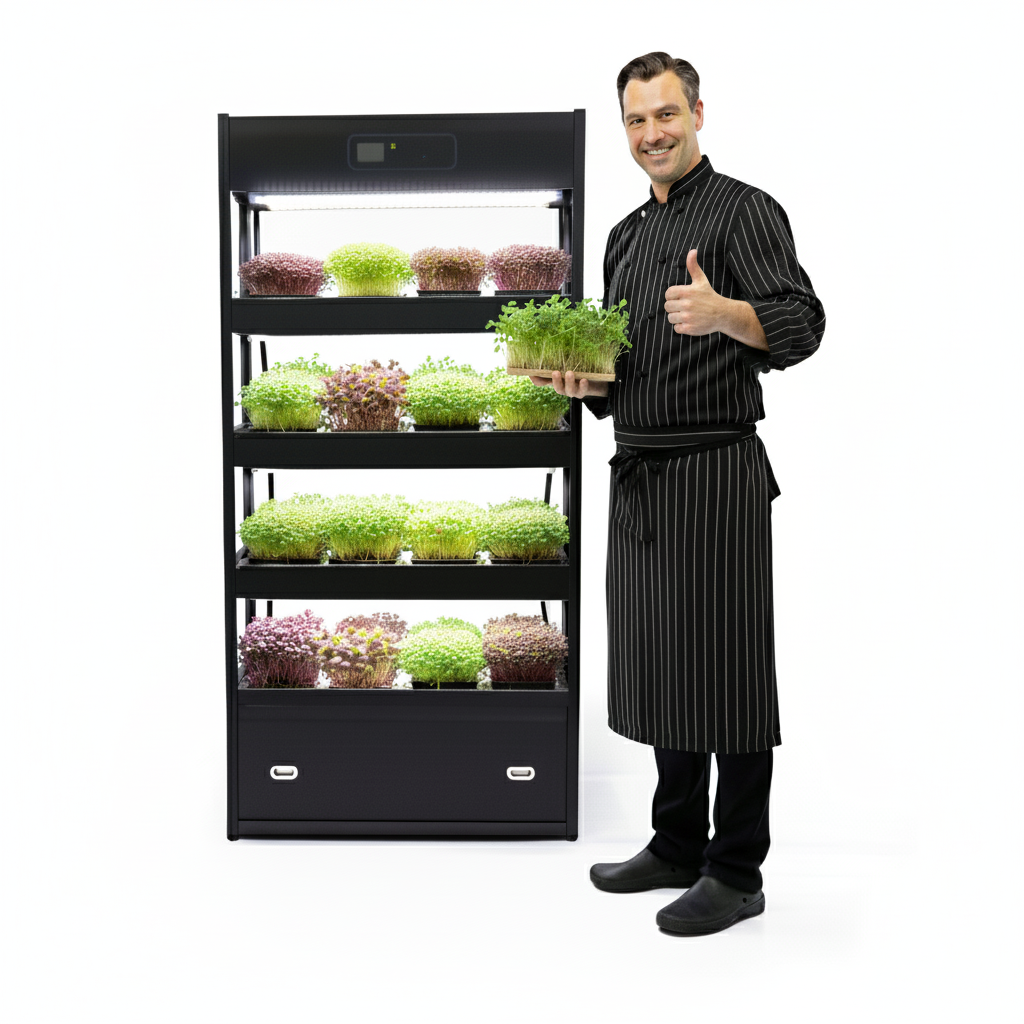 Kweek dagverse microgreens zichtbaar in je zaak! Onze slimme kweekkast regelt alles automatisch, zodat jij je volledig kunt richten op de presentatie. Zo bied je gasten niet alleen constante kwaliteit, maar ook een verhaal van versheid, innovatie en duurzaamheid. Dankzij de voorgezaaide groeimatjes – geleverd op vaste momenten – beschik je altijd over een moeiteloze, betrouwbare oogst.