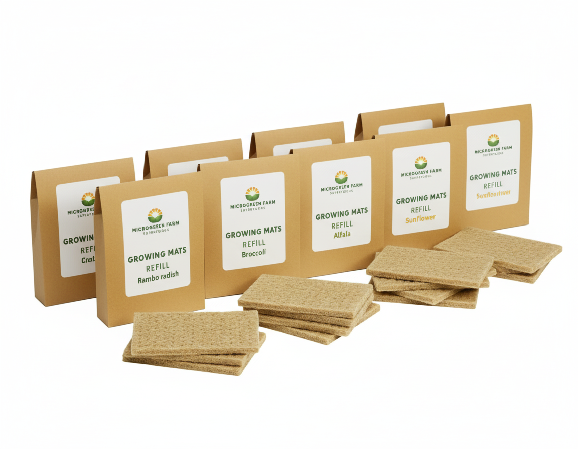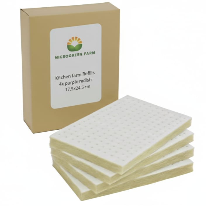 Onze hervullingen zijn kant-en-klare groeimatjes: je legt ze simpelweg in de kweekkast en de rest gaat vanzelf. Elk matje bevat precies de juiste hoeveelheid zaden en wordt in een compacte vorm geleverd, zodat alles netjes bij elkaar blijft en uitgroeit tot een egaal bedje van microgreens. Na gebruik kan het complete matje gewoon in de groene container – volledig biologisch afbreekbaar en circulair. Je kiest zelf hoe je ze ontvangt: via een standaard maandelijkse levering in een doos, of als losse matjes die eenvoudig per post in een envelop worden verzonden. Zo ben je altijd verzekerd van een duurzame en moeiteloze oogst van verse microgreens, precies wanneer jij ze nodig hebt.